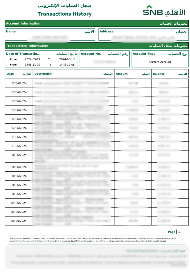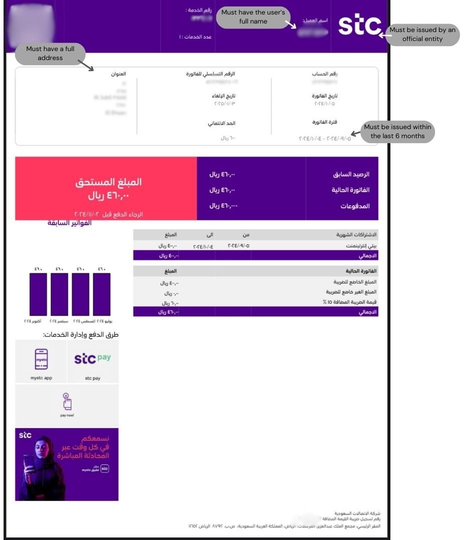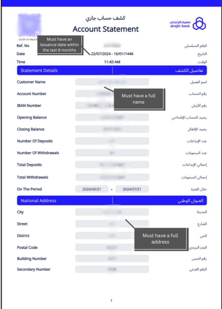 يجب أن يكون هذا المستند قد تم إصداره في أشهر السته الأخيرة ويجب أن يحتوي على المعلومات التالية: