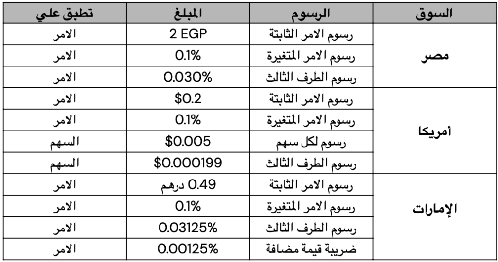 تختلف أنواع الرسوم المفروضة حسب السوق الذي تتداول فيه (مصر، الولايات المتحدة الأمريكية، أو الإمارات العربية المتحدة)، وقد تشمل عمولات التداول، ورسوم الجهات التنظيمية، ورسوم المقاصة أو الحفظ، والضرائب عند الاقتضاء.