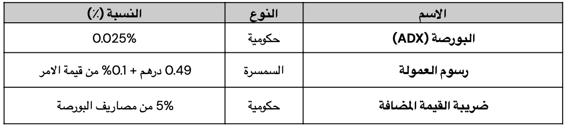 يشمل التداول في سوق سوق الإمارات (ADX) رسومًا من ثاندر وسوق أبو ظبي للاوراق المالية وأطراف ثالثة. فيما يلي تفاصيل الرسوم لكل عملية: