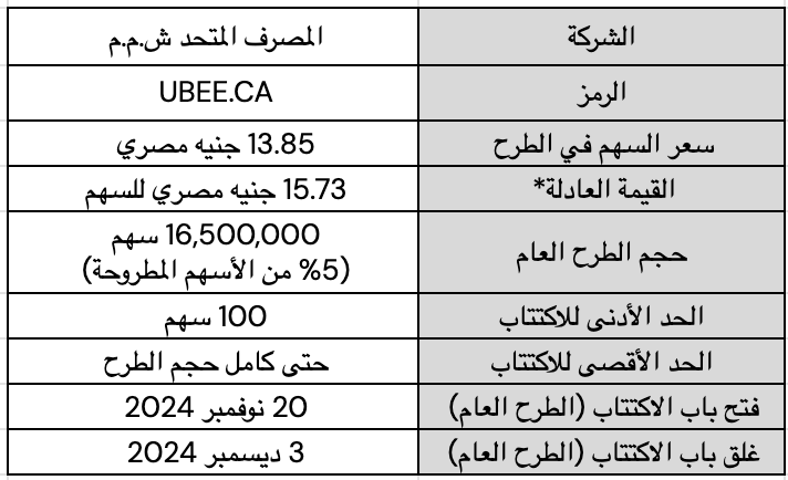 تنويه : تتم الأنشطة في السوق المصري من خلال شركة ثاندر لتداول الأوراق المالية، وهي شركة مرخصة في البورصة المصرية وخاضعة للهيئة العامة للرقابة المالية، ومسجلة في مصر برقم 804. من هو المصرف المتحد؟المصرف المتحد هو بنك مؤسس ومملوك من قبل البنك المركزي المصري، بيقدم خدمات مصرفية للشركات والافراد، مع التركيز علي الخدمات التقليدية والخدمات المتوافقة مع الشريعة الاسلامية. إيه اللي بيحصل؟البنك المركزي المصري، اللي بيملك 99.9% من أسهم البنك، بيطرح 30% (330 مليون سهم) للبيع، وده هيخلي المصرف المتحد شركة متداولة في البورصة المصرية (EGX). تقدر تشترك في الطرح من خلال ثاندر. الطرح ده متقسم لجزئين: