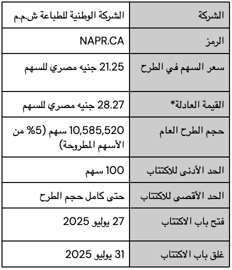 الشركة الوطنية للطباعة هتطرح 5% من أسهمها للمستثمرين الأفراد من خلال البورصة المصرية.