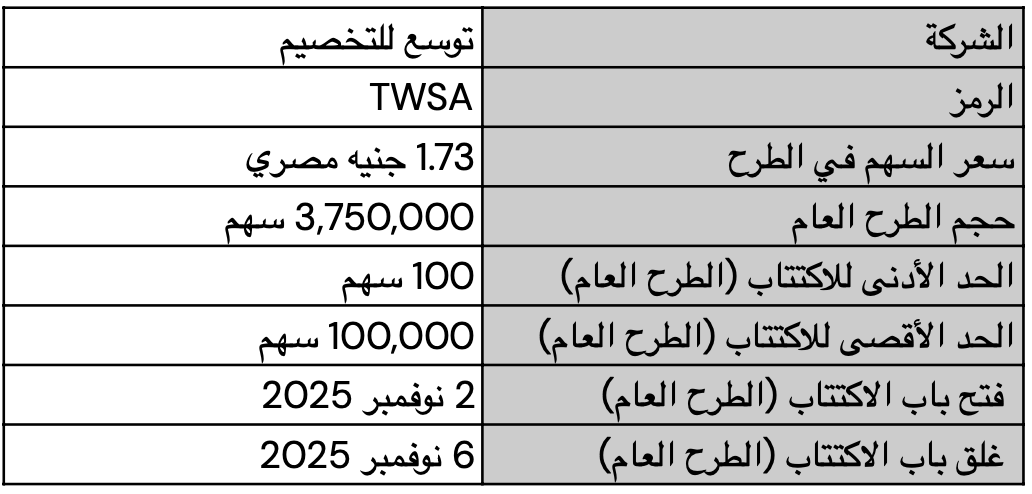 شركة توسع للتخصيم بتطرح أسهمها في السوق المصري للشركات الصغيرة والمتوسطة (SMEs) وبتقدّم 18,750,000 سهم من خلال طرح عام وطرح خاص بسعر طرح 1.73 جنيه للسهم الواحد. الطرح ده بيدي فرصة للمستثمرين الجدد إنهم يمتلكوا أسهم في الشركة.