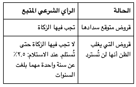 القروض التي يغلب الظن أنها لن تُسترد لا تُدرج في حساب الزكاة السنوي. عند استلام المبلغ، يجب دفع زكاة ٢.٥٪ عن سنة واحدة مهما بلغت السنوات.