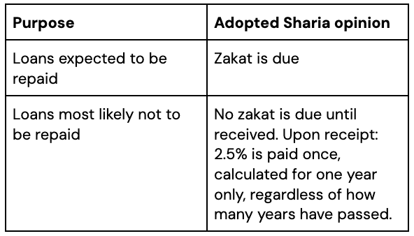 Loans that are highly unlikely to be recovered are not included in the annual zakat calculation. Upon receiving the amount, 2.5% zakat is due for one year only, regardless of how many years have passed.