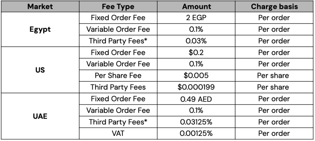 Depending on the market you’re trading in (Egypt, USA or UAE) there may be different types of fees applied to your order. These can include trading commissions, regulatory fees, clearing or custody charges, and taxes where applicable.